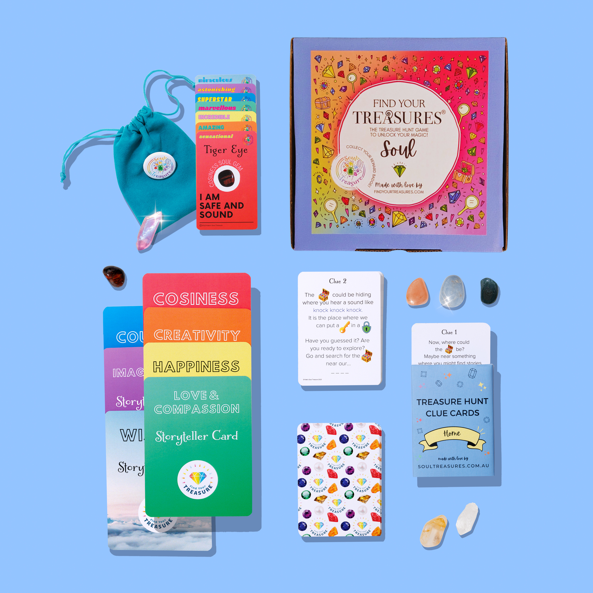 Find Your Treasures is an exciting treasure hunt game designed for play at home. Children uncover hidden clues, solve rhyming riddles and discover their treasure! Real gemstones and crystals that help unlock their inner strengths through engaging affirmation cards and storytelling prompts.